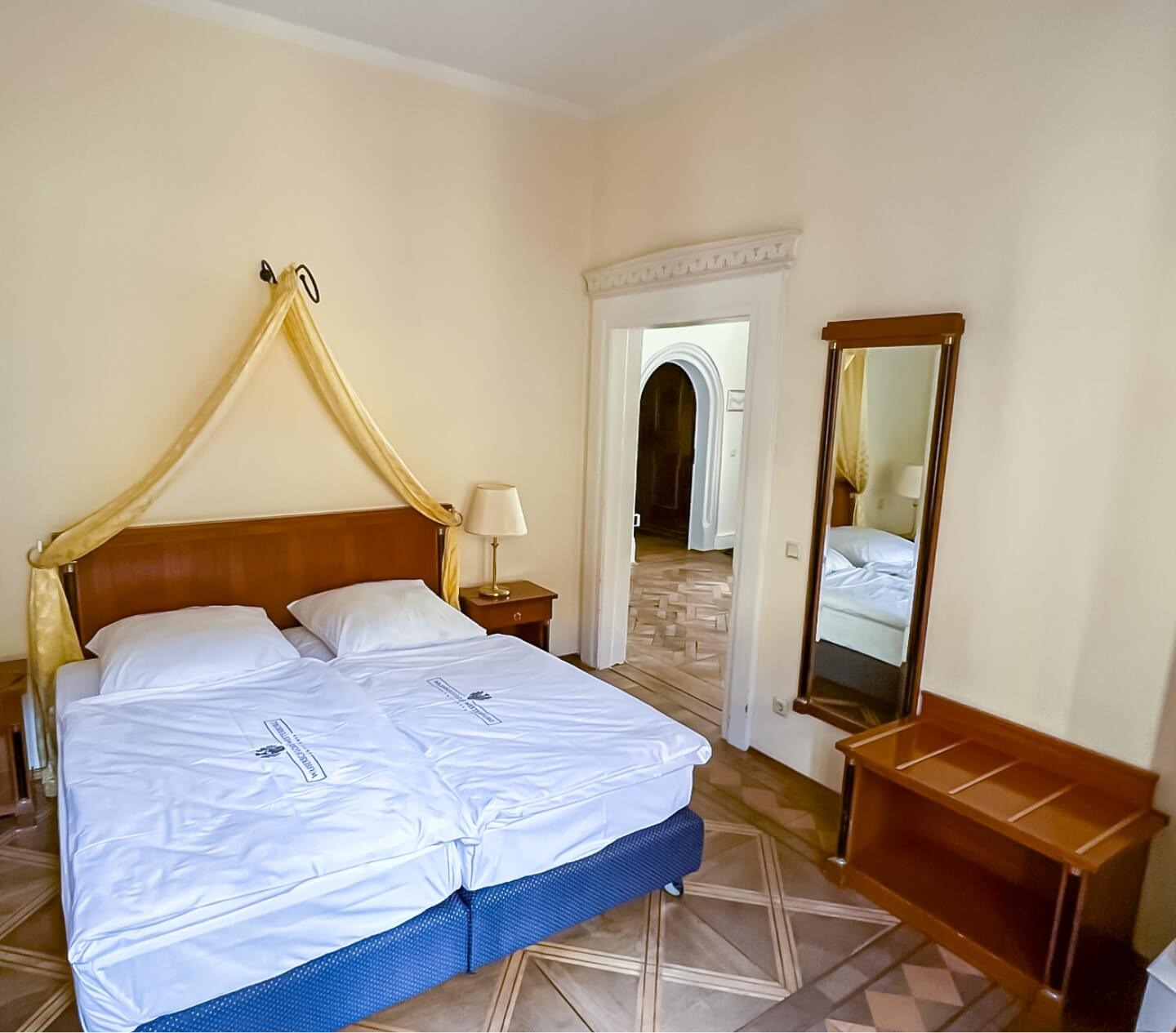 Aus diesem Zimmer unseres Hotels haben Sie einen wunderschönen Blick auf den Schlosspark. Das Wohnzimmer ist mit italienischen Stilmöbeln ausgestattet. Das Zimmer ist 26 m² groß. Von hieraus können Sie mit dem Bademantel in unseren Wellness- und Beautybereich gelangen.